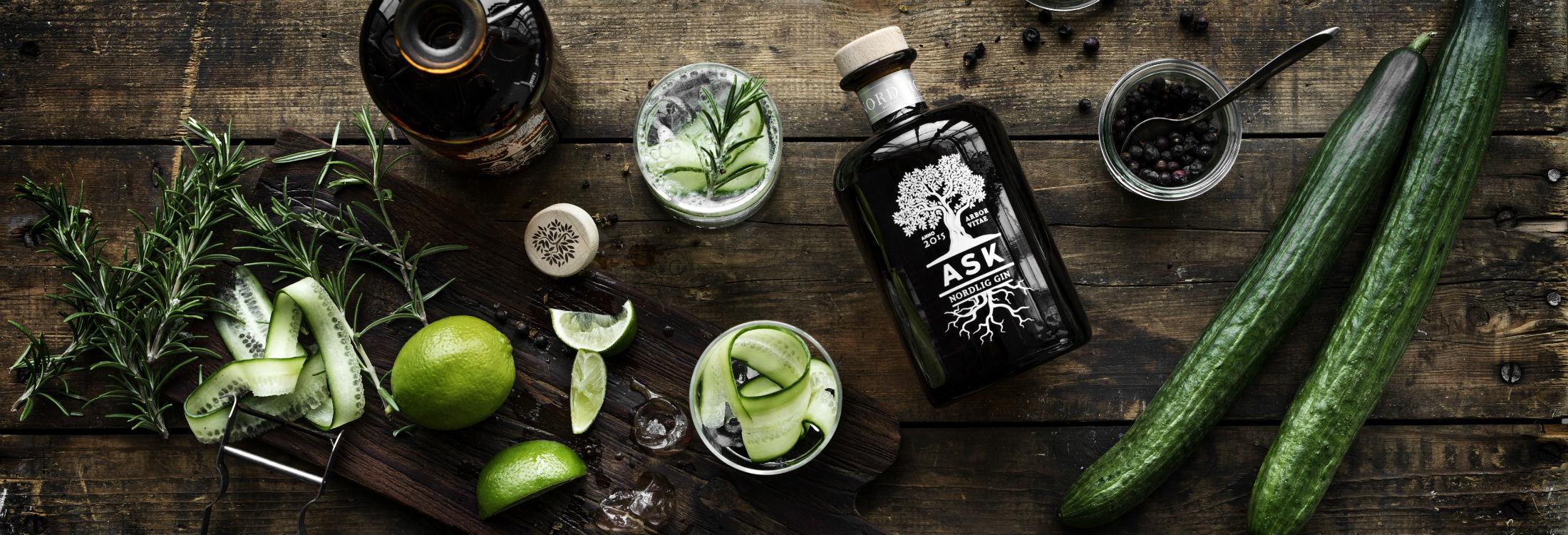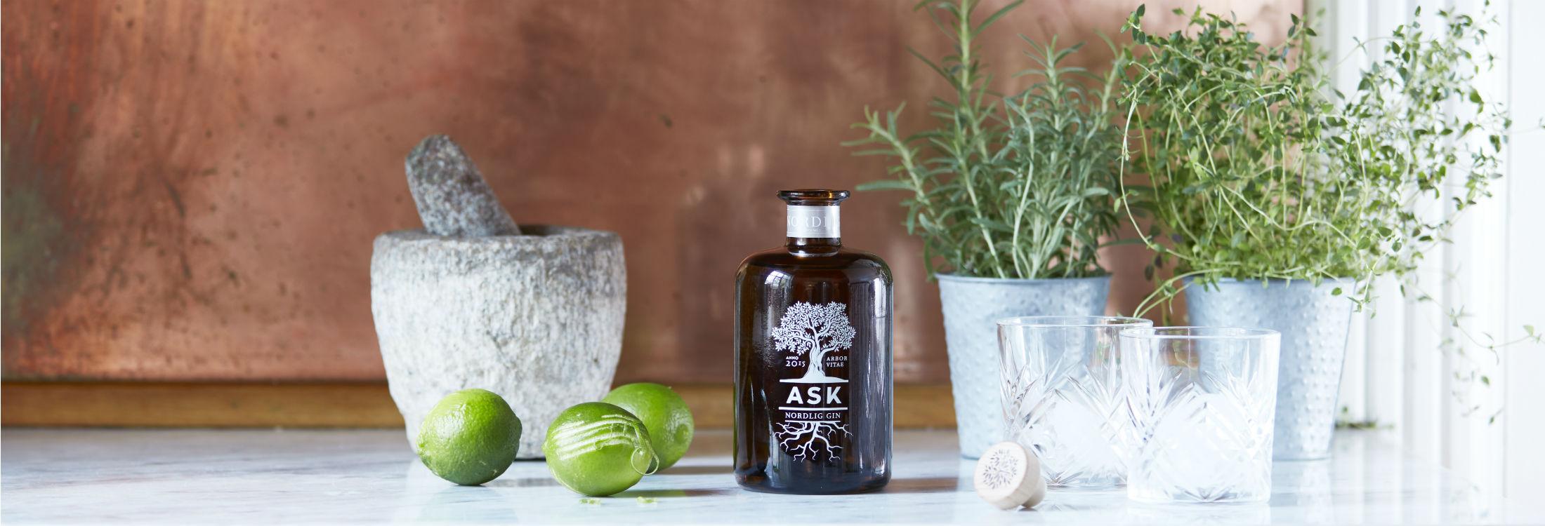 ASK Nordlig Gin er 100% håndlavet og destilleret på de gamle nordiske lægeurter; jernurt, stenurt, sarurt og salturt. Man mente tidligere, at disse urter styrkede hjerte, lever og sjæl – om det stadig gælder, kan vi ikke sige, men smagen er enestående og helt unik. Friske noter af enebær, citrus og kardemomme, danner sammen med ask-urterne en karakteristisk gin-oplevelse. Denne spændende London Dry Gin sætter sit helt eget præg på de klassiske Gin & Tonic opskrifter og serveres fra en lige så karakteristisk flaske, der fortæller historien om asketræet, der har vokset i Danmark i mere end 8000 år. I Nordisk mytologi kaldes asketræet ”livets træ”, Yggdrasil. Yggdrasils krone er altid grøn og rækker helt op til himlen. Under træets rødder springer en kilde frem med visdommens vand til træet. Den dug, der falder fra dens blade, holder jorden grøn.