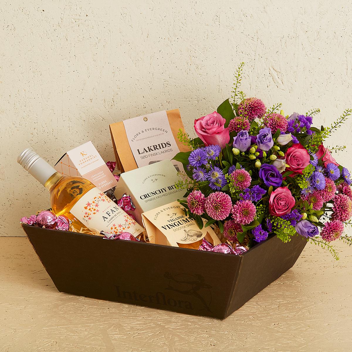 Glæd modtager med denne gavekurv. Gavekurven sammensættes af vores florister og indholdet kan derfor afvige fra det anviste på billedet, heriblandt også alkohol, alt efter butikkens sortiment, men vil altid have den værdi der bliver bestilt for.