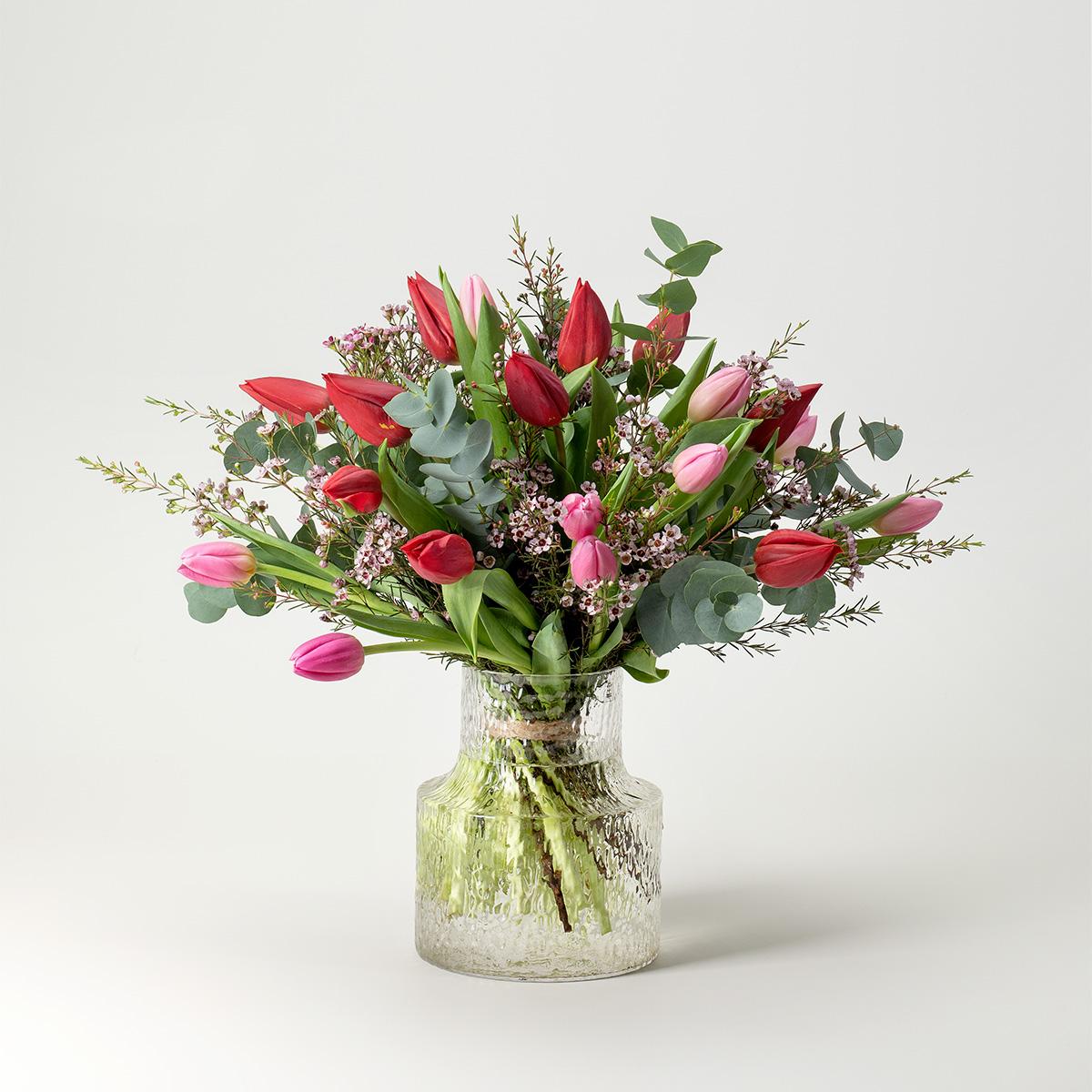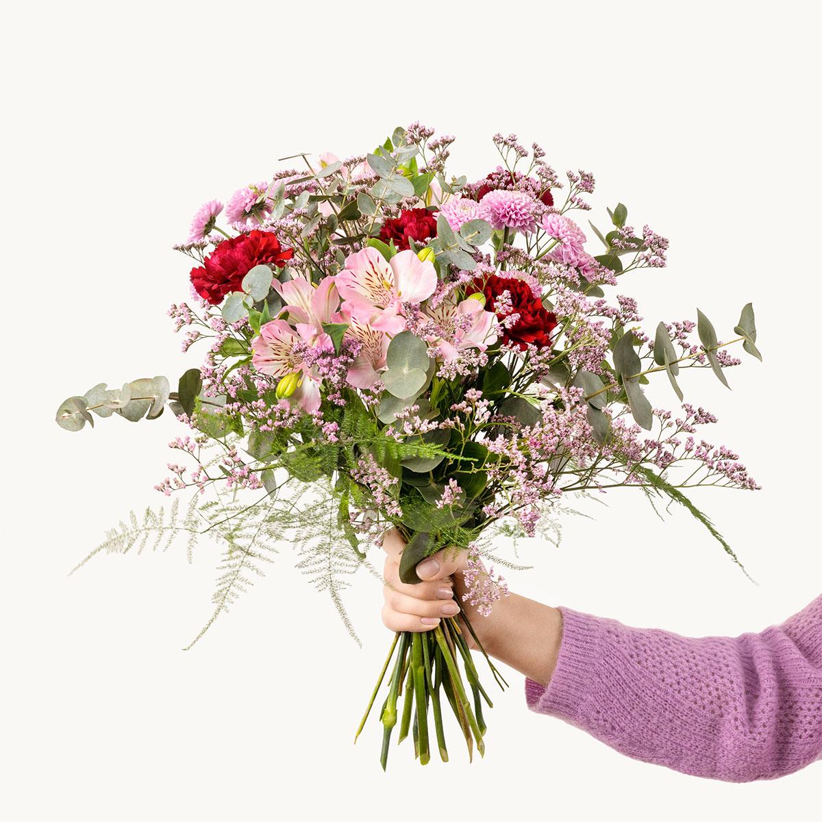 Floristens kreative buket i lyserøde nuancer med duftlys